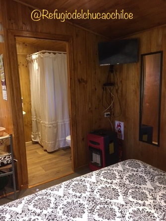 Cabaña para dos personas, consta de cama matrimonial baño privado, televisión, wifi y pequeña cocina. Estamos ubicados a 15km al norte de Castro y a 8km de Dalcahue, en un lugar tranquilo con amplias áreas verdes. Muy cerca de aeropuerto, y locomoción afuera de nuestras instalaciones.