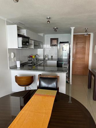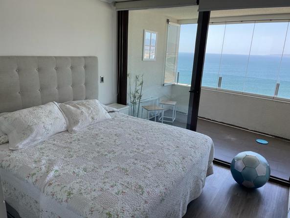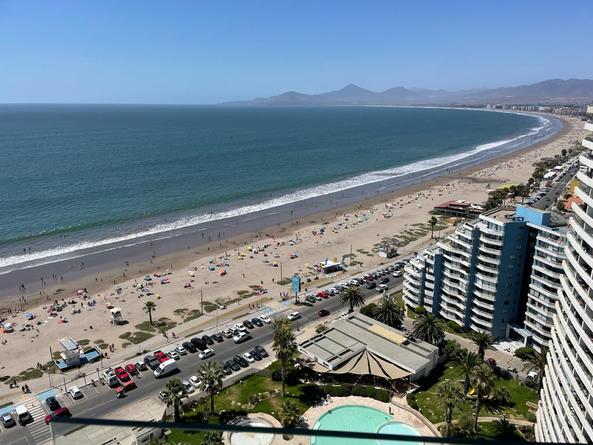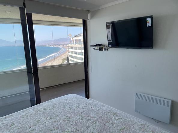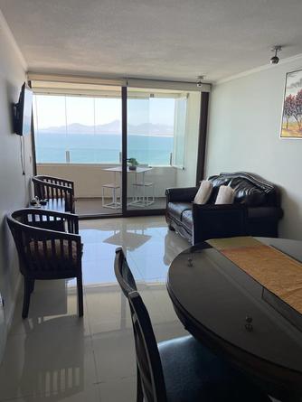 Arriendo diario en primera línea La Serena departamento en condominio jardín del mar habilitado para cinco personas dos dormitorios dos baños cocina totalmente equipada cable y Wi-Fi estacionamiento piscina temperada jacuzzi ubicado en el piso 25 con una vista panorámica desde la terraza amplia, en la avenida del mar