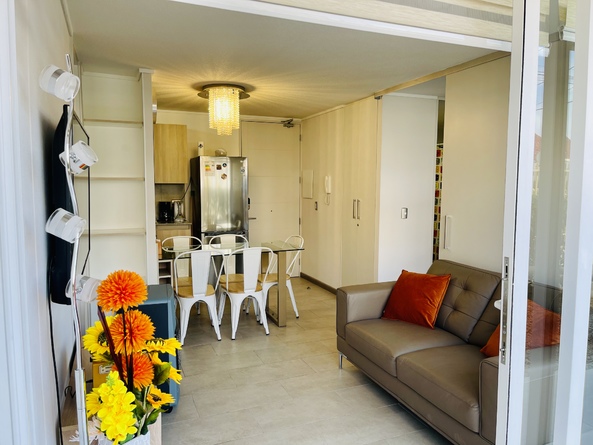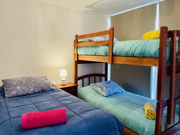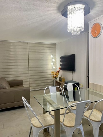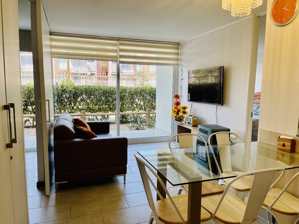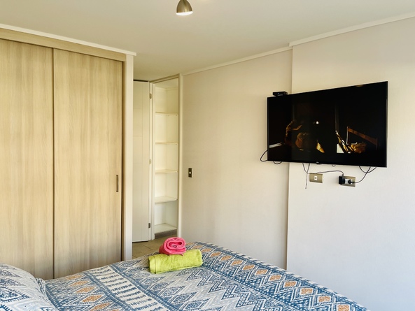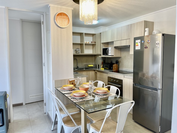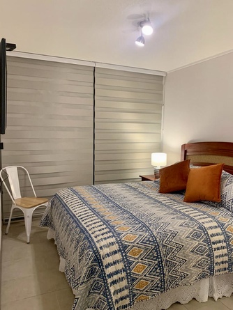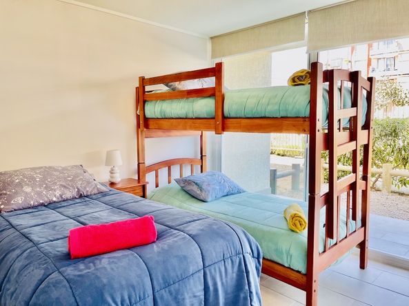 Este departamento está en el condominio Cuatro Esquinas, es de dos dormitorios y dos baños, se encuentra en la zona más concurrida de La Serena, a media cuadra de la playa, habilitado para cinco personas, en el primer piso del edificio Pacífico, lo que da mucha tranquilidad para familias con niños.