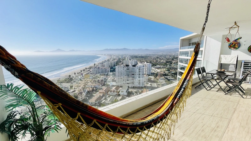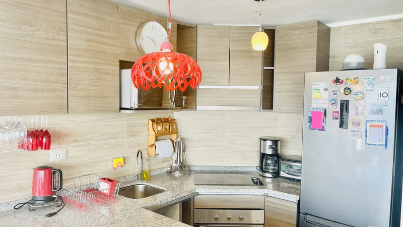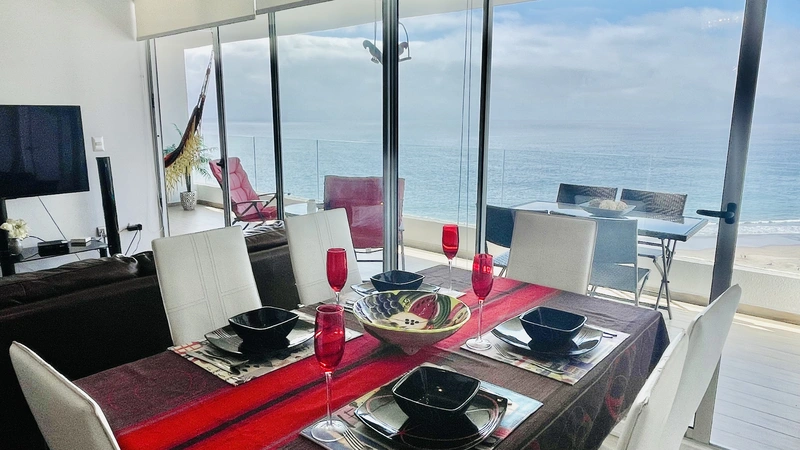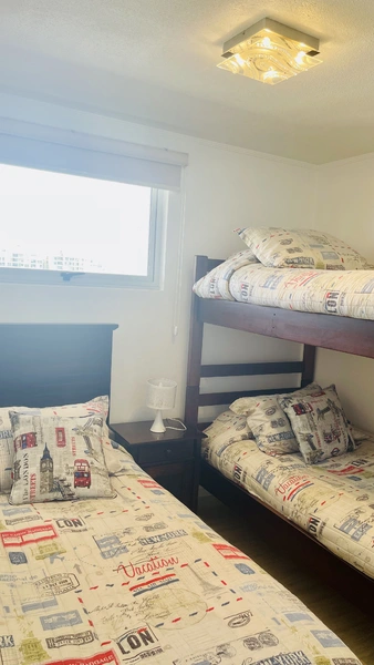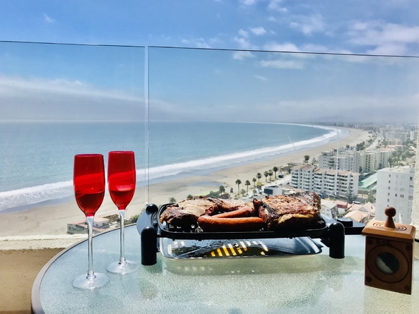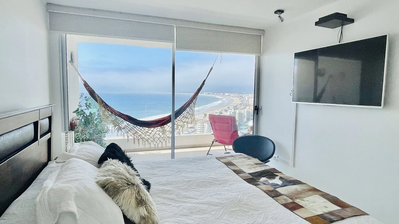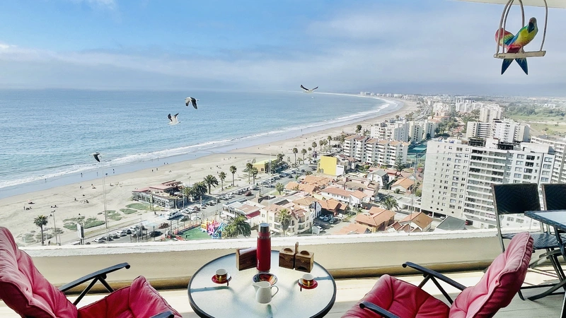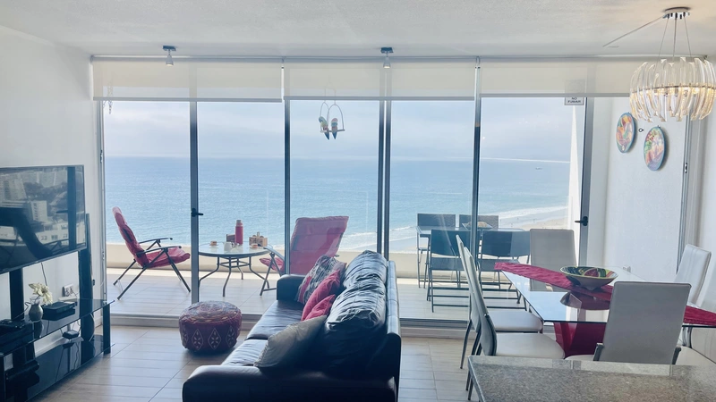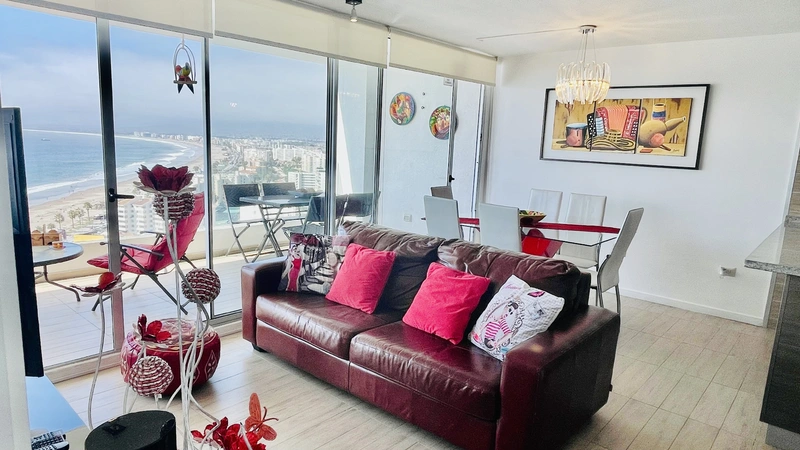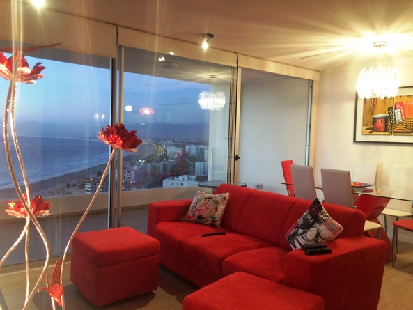 La "Choza VIP Roja" Tiene todo lo que en esencia esperas para estar cómodo... Ubicada a pasos del casino Enjoy, en Peñuelas, frente al mar con una hermosa vista desde el piso 21, cuenta con 2 dormitorios y 2 baños, habilitada para 5 personas. En suite matrimonial, tiene cama King nueva con cortinas roller black out, que no te quitarán la espectacular vista que tendrás incluso desde la comodidad de la cama. Smart TV de 48" conectado a televisión por cable. Baño en suite y de visitas tienen tina. En segundo dormitorio hay un camarote o cucheta, más una cama individual. Living comedor muy cómodo, con mesa grande para 6 personas. Smart TV de 55", conectado a TV Cable con canales HD. Home Theater 5.1, DVD, CD, Blue Ray, todo puede conectarse via bluetooth a tu celular si deseas, obteniendo un excelente sonido.