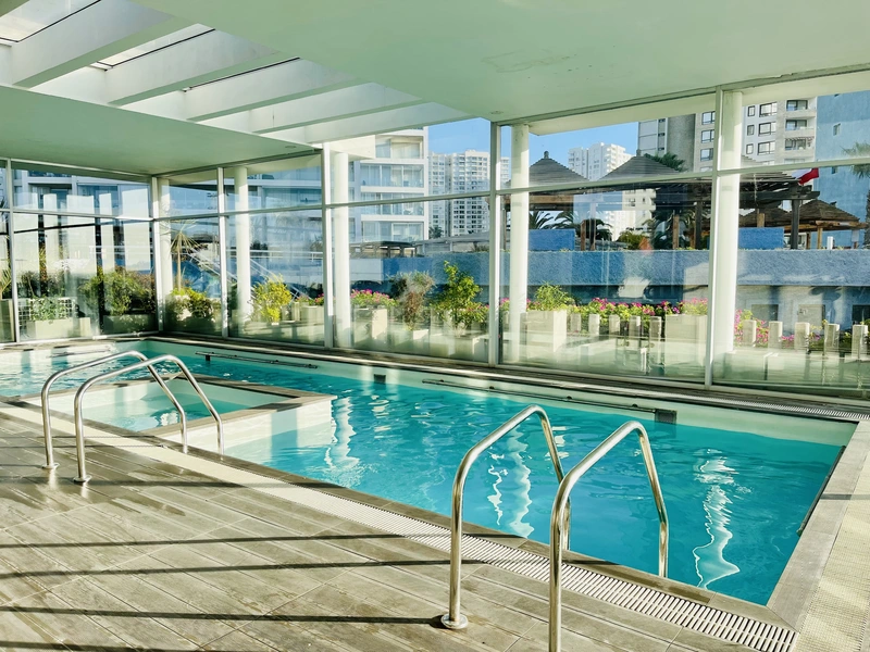 Quinchos para asados y salón de eventos se encuentran en la terraza del edificio y se cancela en administración por su uso. Gran piscina de borde infinito para adultos y niños, con reposeras para descansar. Piscina temperada de acceso controlado. Gimnasio Sauna Lavandería. Estacionamiento propio para un automóvil. Sábanas y toallas de ducha.