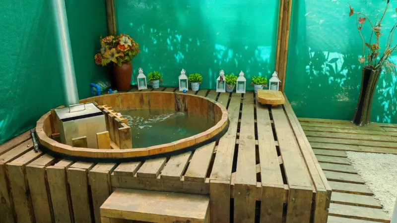 Cabaña para 8 pasajeros: 2 dormitorios, (1 matrimonial, 2do dormitorio para 6 personas) Sala de estar con cocina equipada, sala de baño con ducha, Deck con tinaja privada a combustión de leña.
