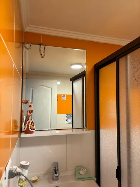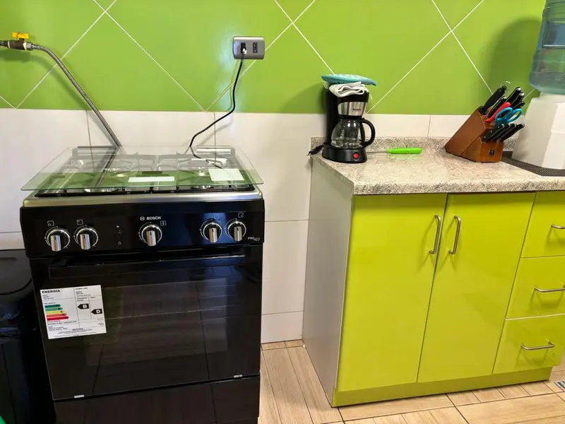 Cocina refaccionada con refrigerador, microondas, cocina, cafetera, hervidor. Baño moderno con ducha y agua caliente, shower door.