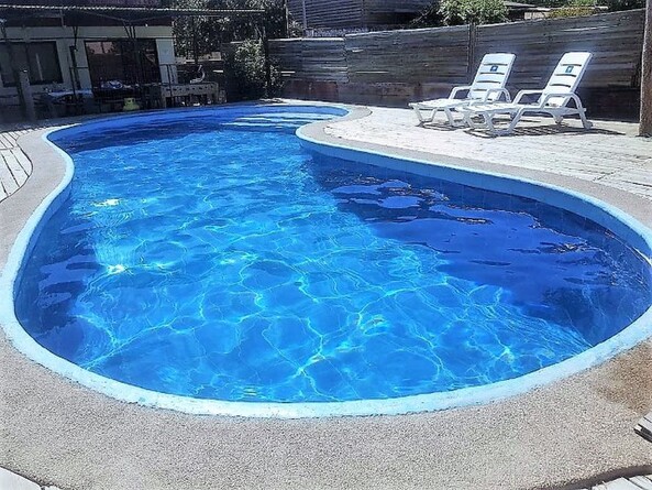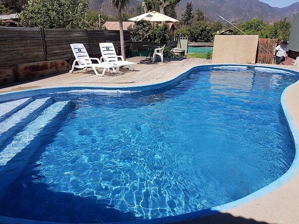 terraza con vista piscina , parrilla