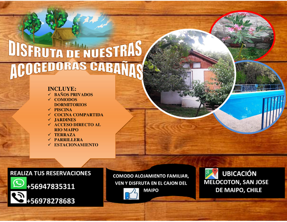 Cómodo alojamiento familiar en dormitorios individuales con baño privado, piscina, cocina compartida, jardines, acceso directo al rio Maipo, terraza, parrillas, estacionamiento, etc. todo lo necesario para un merecido y grato descanso a 6kms. de San Jose de Maipo, valor por dia para 2 personas