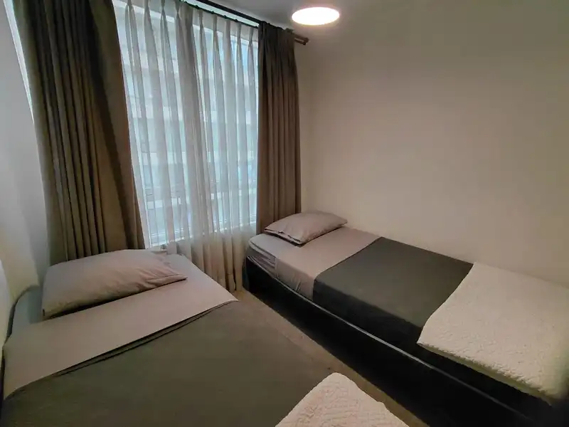Departamentos dos dormitorios, y dos baños, con cama matrimonial en dormitorio, dos camas individuales en segundo dormitorio, más cama nido y futón en living. Capacidad hasta para 6 o 7 personas.