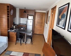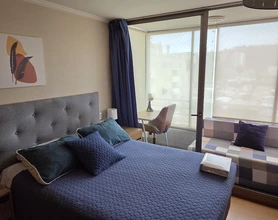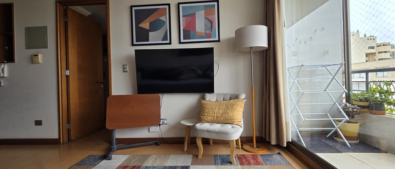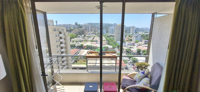 Está en un piso 12 con malla de seguridad en el balcón (por si viaja con niños) y vista al sector oriente de la ciudad.
